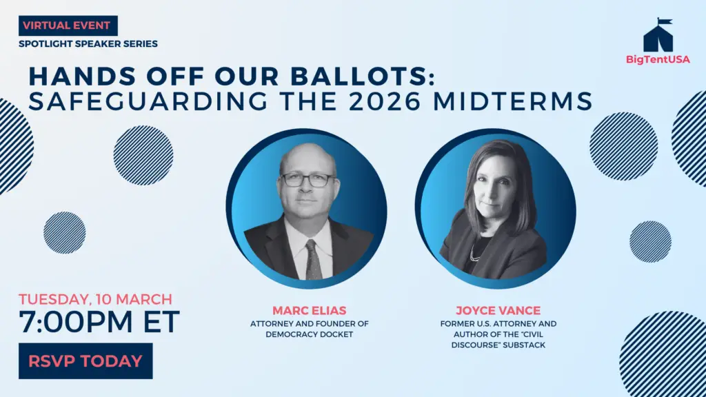 BigTentUSA is a nonprofit powered by people who care deeply about democracy. We make it easy to learn, speak up, and take action—because informed, engaged citizens are the key to a thriving democracy.