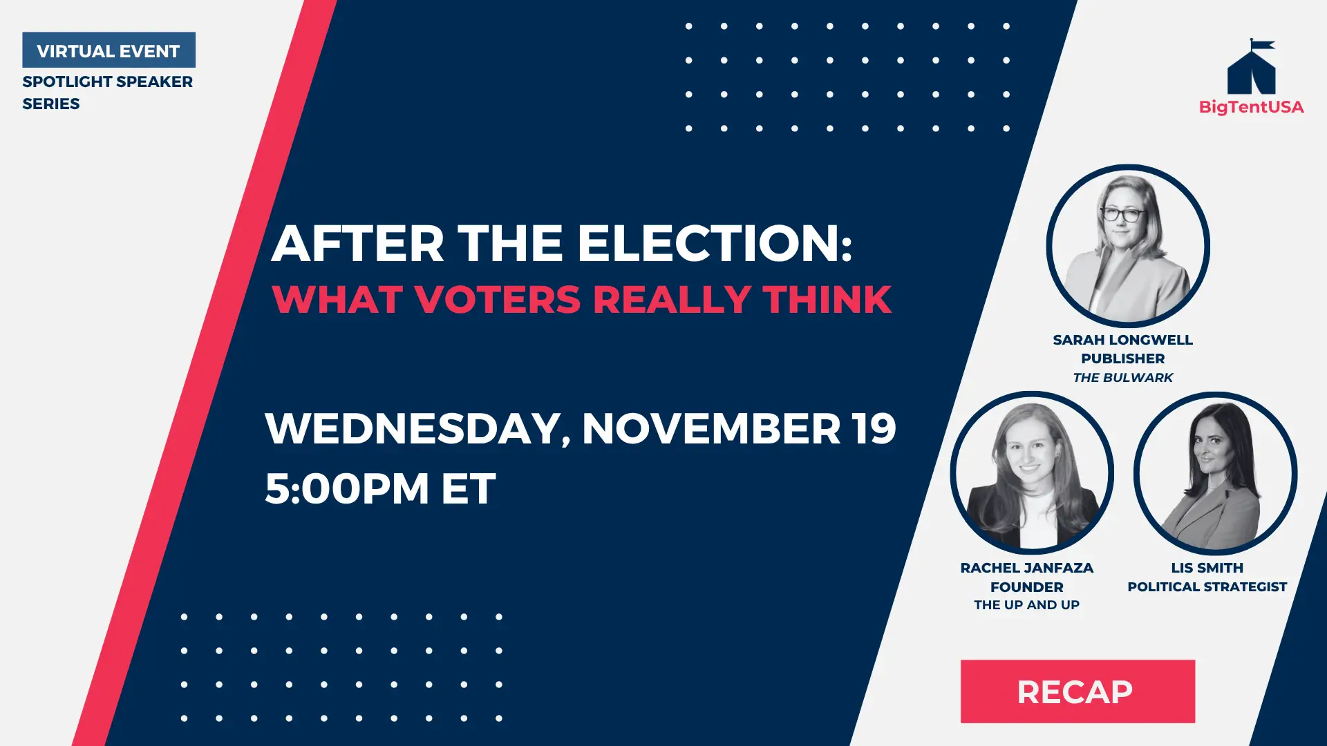 BigTentUSA hosted a lively post-election conversation on November 19 with Sarah Longwell of The Bulwark, journalist and founder of The Up and Up Rachel Janfaza, and political strategist Lis Smith. The […]