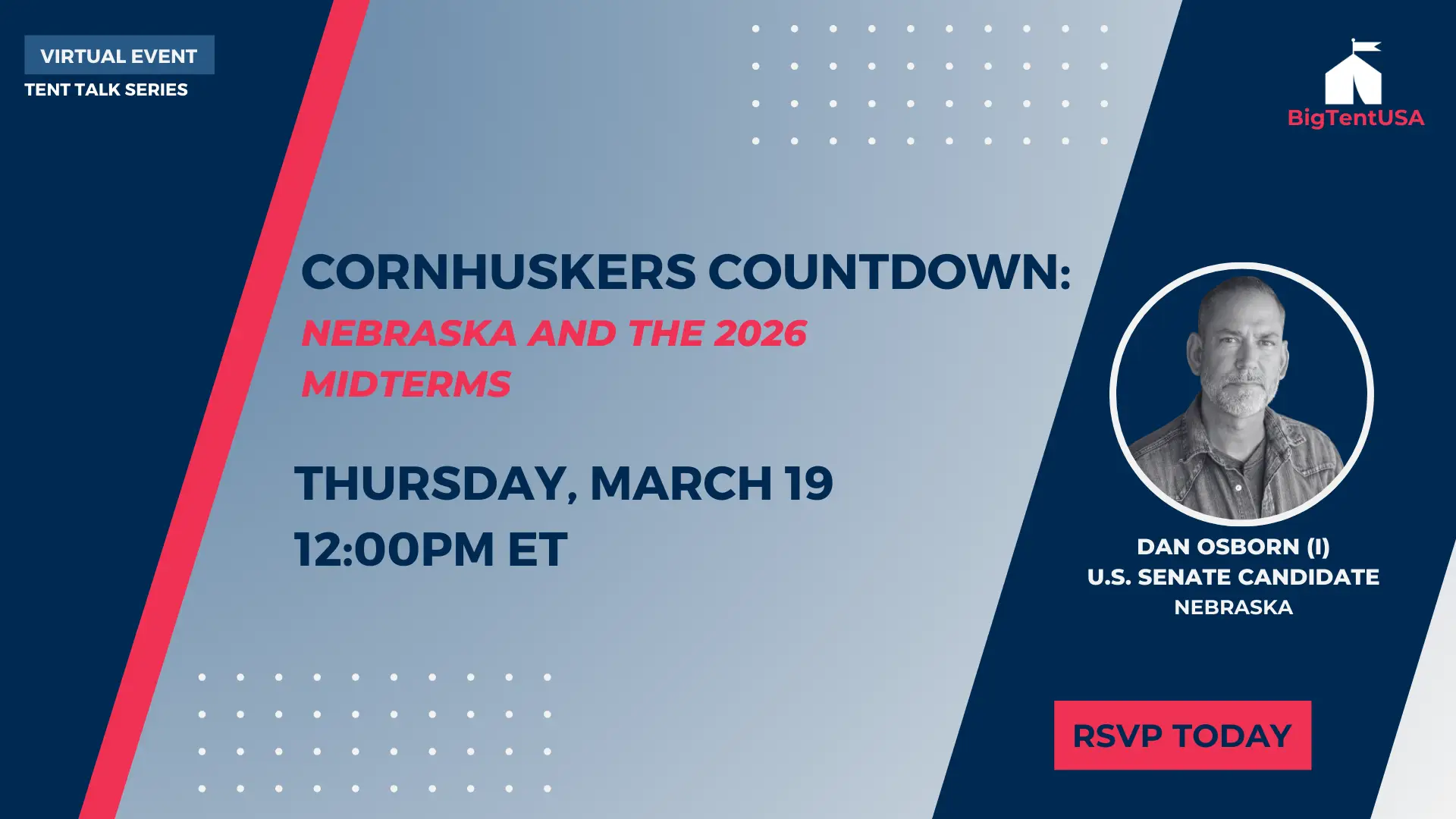 What’s really happening in Nebraska politics—and what should people know about it? Join BigTentUSA on Thursday, March 19, at 12pm ET for a timely virtual conversation with Dan Osborn, an independent candidate for U.S. Senate, about what’s shaping the 2026 midterm elections in the Cornhusker State. For many Americans, Nebraska’s political landscape is often overlooked—but the dynamics playing out there offer a revealing snapshot of the forces shaping national politics. In this discussion, we’ll break down the key issues, political realities, and voter dynamics driving the race, and what they could signal for the broader midterm environment.  Don’t miss this […]